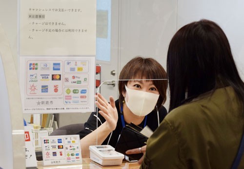 [写真/支払窓口でキャッシュレス決済の案内をする職員 ]