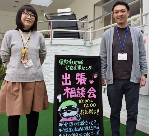 [写真/「来年度もやります」と相談会をアピールする東部南地域包括支援センター職員 ]