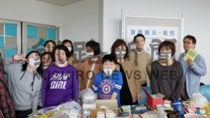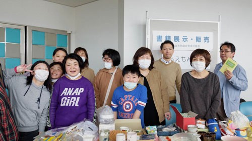 [写真/「福祉のつどい」(2月16日)で本の販売をする会員親子 ]