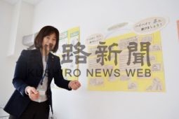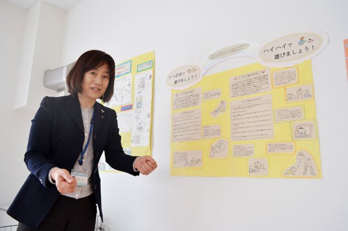 [写真/施設内でも紹介しているバスタオル遊びについて説明する岡本室長 ]