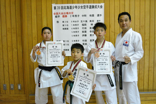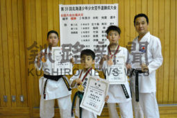 [写真/小学2年男子組手で全道優勝した中町(左から2人目)。2年連続で全国切符をつかんだ ]