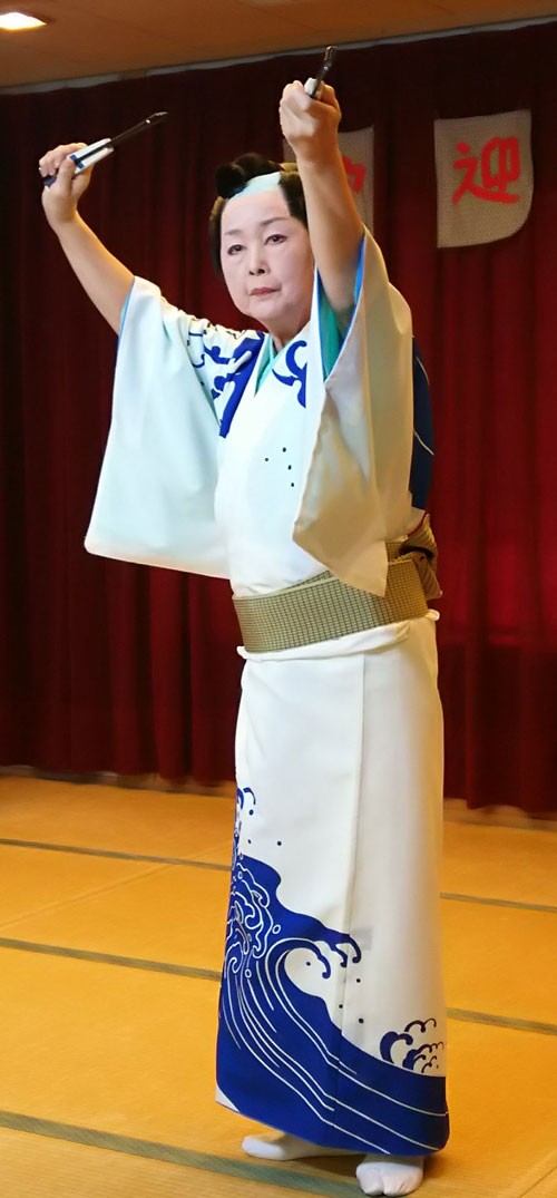 [写真/趣向を凝らした日舞を披露した芳柳良眞さん(下)と寿々良会主(北園啓生園) ]