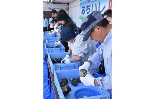 [写真/ホッキ貝の早むきに挑戦する来場者 ]