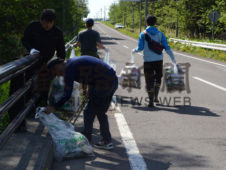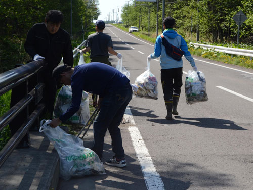 [写真/河川敷や路肩のごみを拾い集める参加者(26日、中標津町) ]