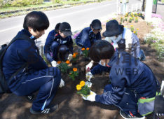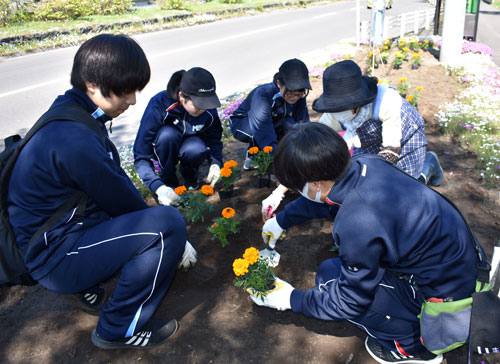 [写真/花の苗を植える美原中コンピューターボランティア部員(美原3丁目町内会) ]