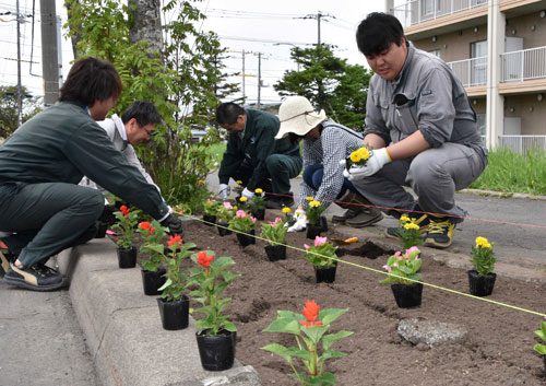 [写真/道道沿いに彩りを添える渡部建設工業の社員 ]