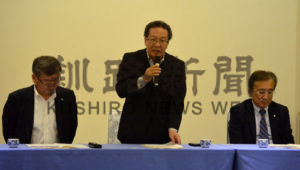 [写真/総会であいさつする濱谷会長(中央) ]