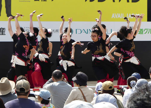 [写真/総勢11人の阿寒高校チームの舞にひときわ大きな拍手が送られた ]