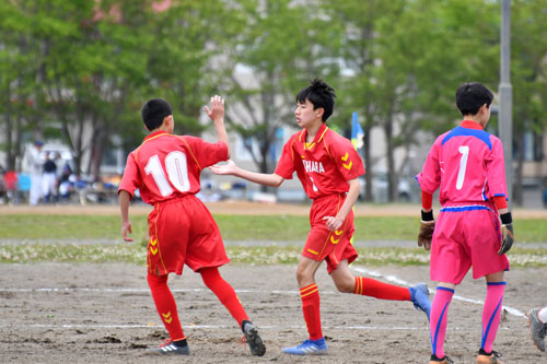 [写真/【K2、釧路町富原―INFINITY】前半2分、ヘディングで先制点を決めた釧路町富原の石部獅旺(中央)。チームメートとハイタッチ ]