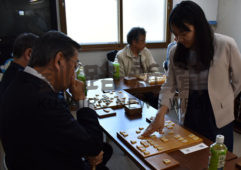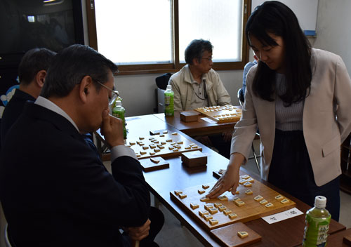 [写真/「つみきの仲間の会」の有段者を相手に指導対局を行う中村女流三段 ]