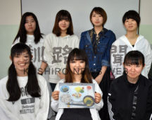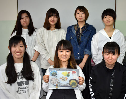 [写真/「私たちが作った健康メニューをどうぞ」と臨床栄養学ゼミの学生 ]