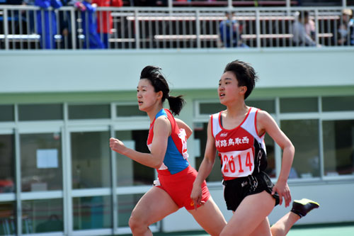 [写真/陸上女子100㍍。釧鳥取西3年の菊池妃菜希と浜中散布3年の南うらら(右から)の2強。釧根中学記録12秒37は射程距離 ]