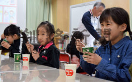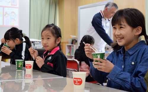 [写真/オロナミンミルクを味わう児童ら ]