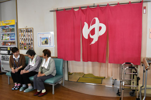 [写真/温泉気分を楽しんだ後に施設職員と談笑するデイサービス利用者 ]