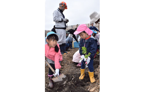 [写真/一日も早い成長を願って木を植える園児ら ]