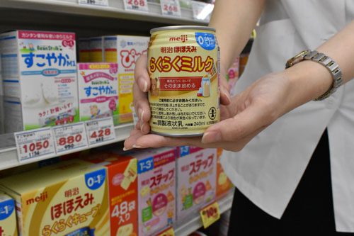 [写真/市内のドラッグストアなどでも販売されている液体ミルク。災害時の環境下でも品質を保護できるスチール缶を使用している(ツルハドラッグ川北店) ]